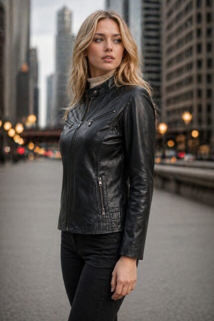- Elevate your style with this timeless black leather jacket for women