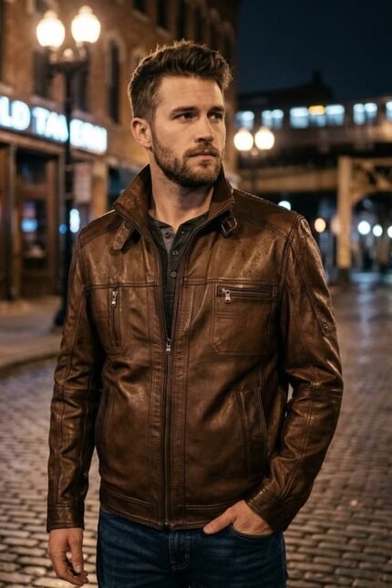 Men’s Classic Brown Leather Jacket – Premium Button-Down Front Slim Fit