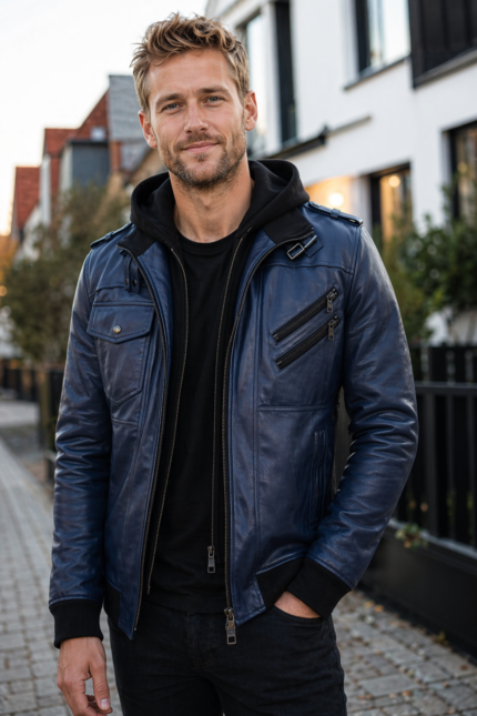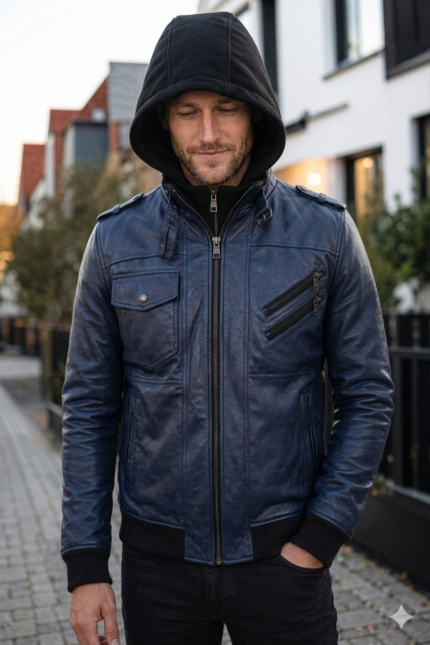 Armond Navy Blue Hooded Leather Bomber Jacket for Men