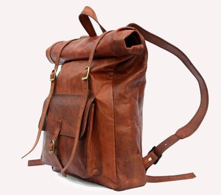Vintage Full Grain Leather Backpack – Handmade Brown Roll Top Laptop Rucksack for Travel, Work & Everyday Use