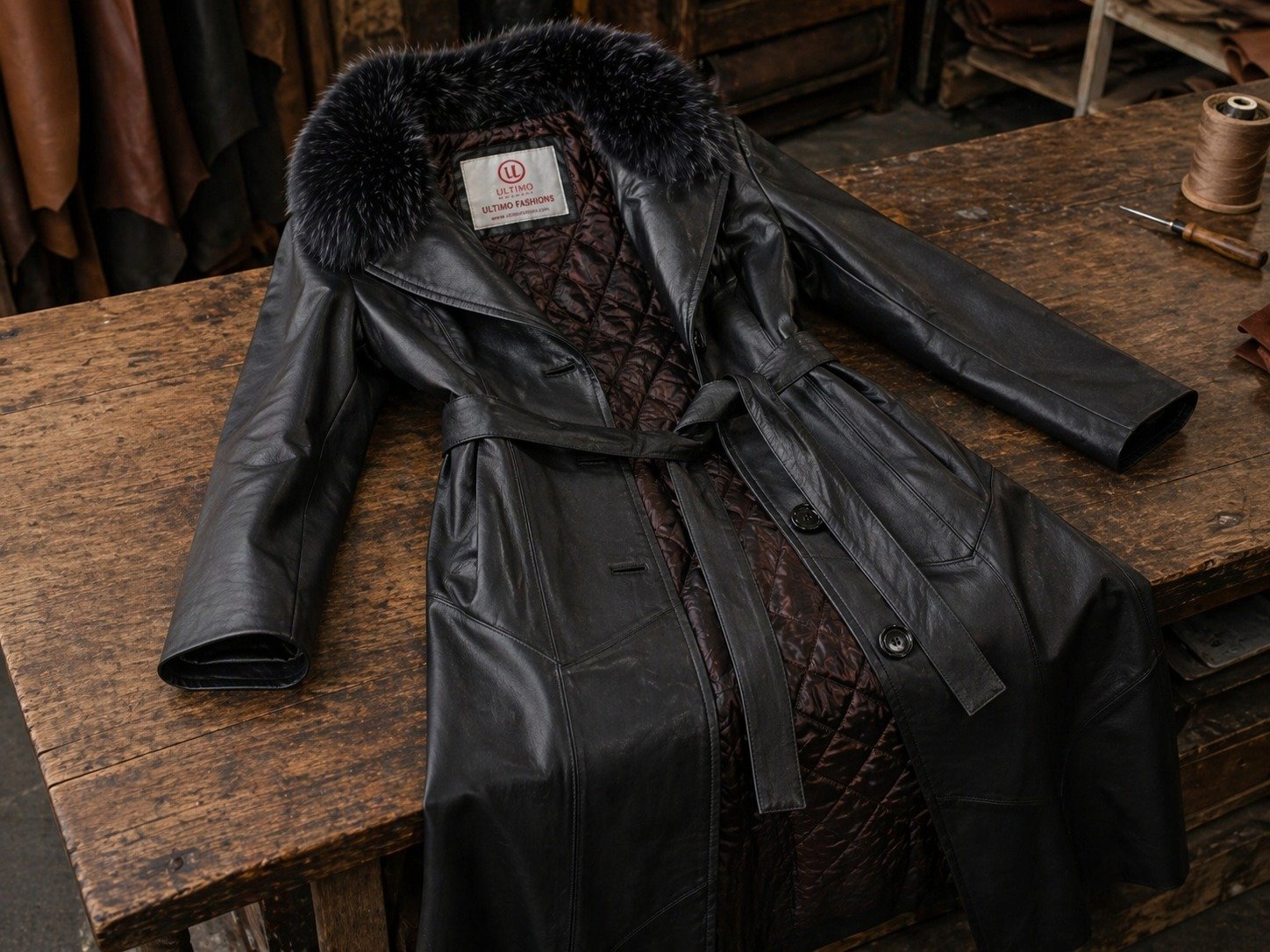 Made from premium-quality leather, it features a soft, natural finish that enhances its rich black tone. The standout fur collar adds a touch of luxury while providing warmth, making it ideal for cooler days.