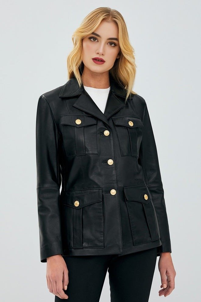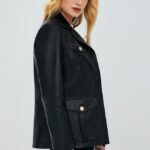 Introducing the Bella Women’s Black Leather Coat – a fusion of timeless style and practicality. This stunning coat features a button closure that adds a classic touch to your ensemble. Crafted from premium distressed sheepskin. With 2 chest button pockets and 2 side button pockets, it effortlessly combines fashion with functionality, offering convenient storage options for your essentials. Crafted with attention to detail, the black leather exudes a sleek and versatile charm. YKK zip for durability. Whether you’re heading to the office or going for a casual outing, this coat complements your look with elegance and ease. Elevate your wardrobe with this essential piece of outerwear.