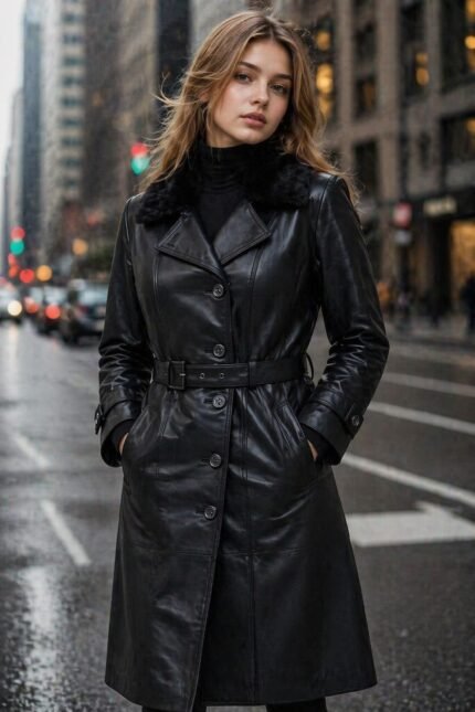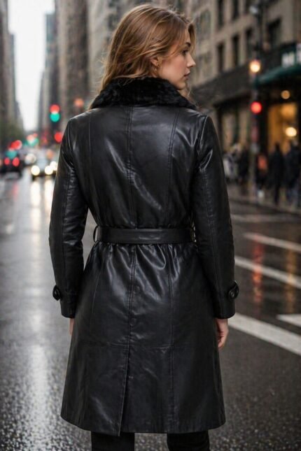 Featuring a tailored fit that flatters the feminine form, this coat includes a classic collar, high-quality stitching, and thoughtfully placed seams for a refined finish. The rich black hue pairs effortlessly with any ensemble, while the supple sheepskin leather provides natural insulation to keep you warm without compromising style.