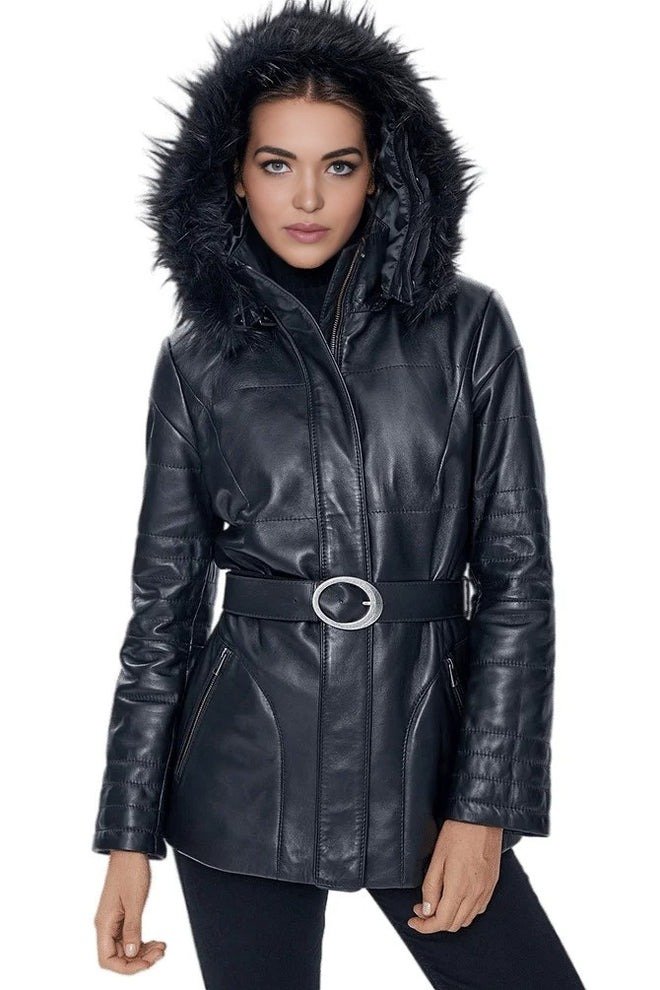 The Dorothy Women’s 100% Real Black Leather Fur Collar Short Belted Trench Coat is the perfect blend of luxury, style, and edgy sophistication. Crafted from 100% genuine black leather, this coat features a rich, supple finish that exudes premium quality and timeless appeal. The soft fur collar adds warmth and a touch of refined elegance, elevating the look for cooler weather while making a bold fashion statement.