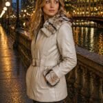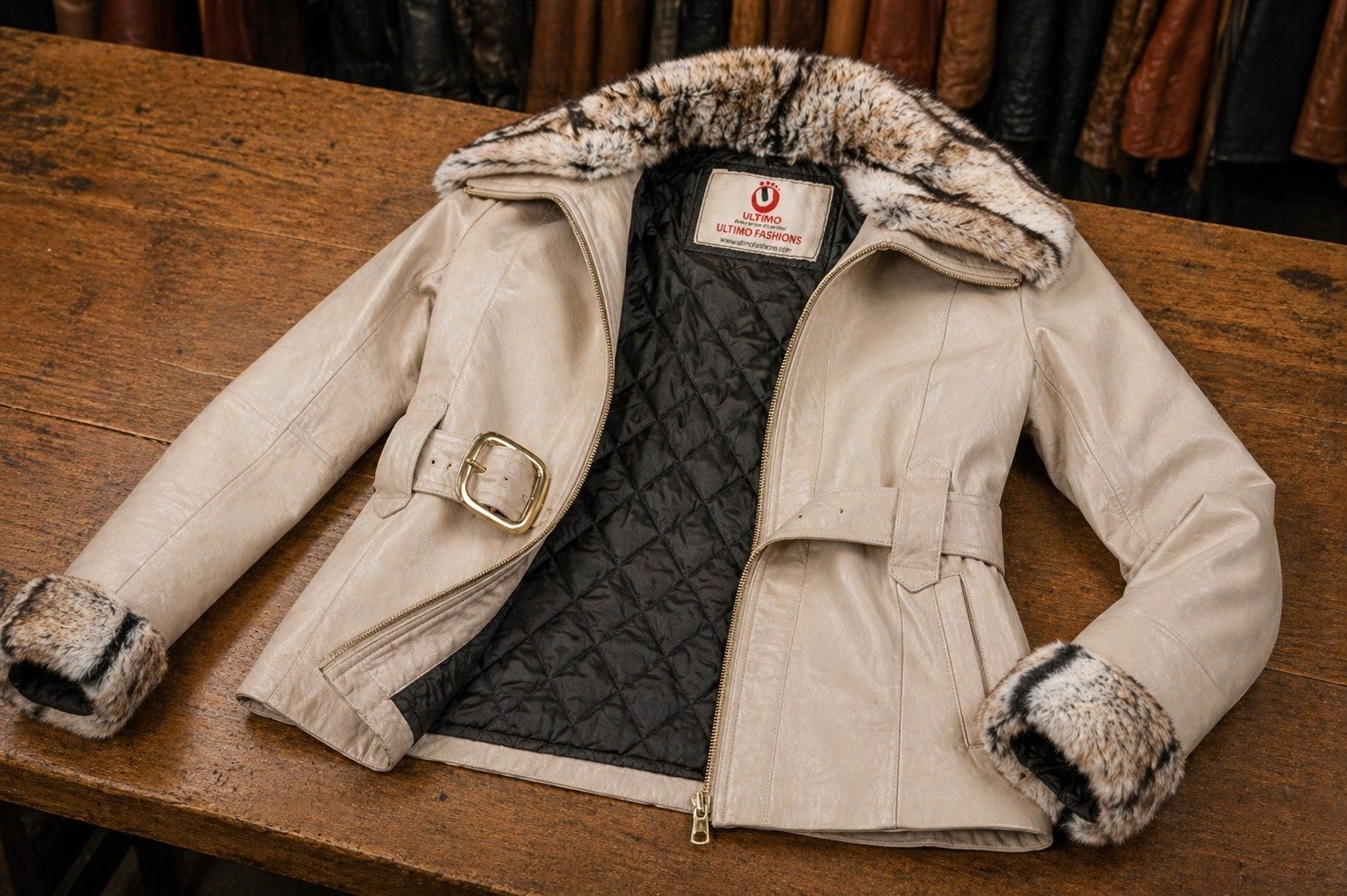Women’s Ivory Leather Jacket with Fur Collar & Belted Silhouette