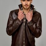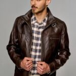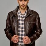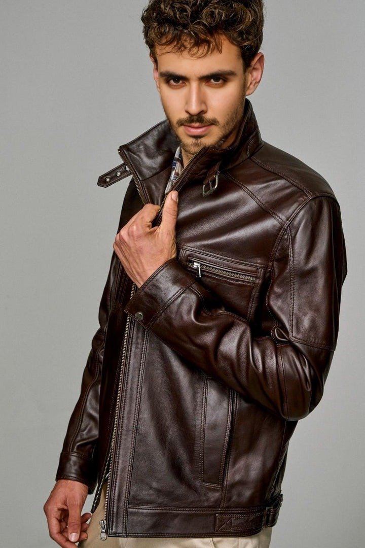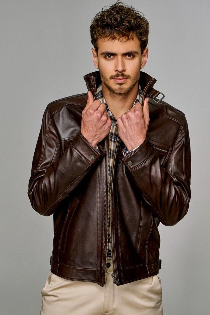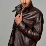 Introducing our Men’s Dark Brown Leather Jacket with a high belt-closure collar, a true testament to rugged elegance and modern utility. Crafted from premium distressed leather, this jacket exudes a unique weathered charm that speaks of character and durability.