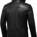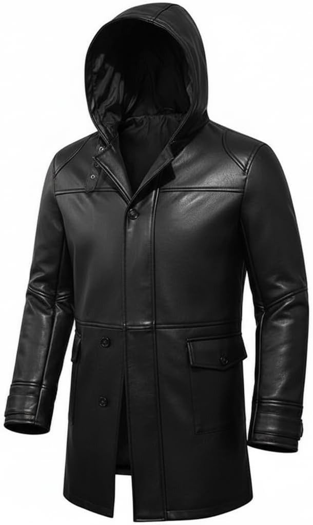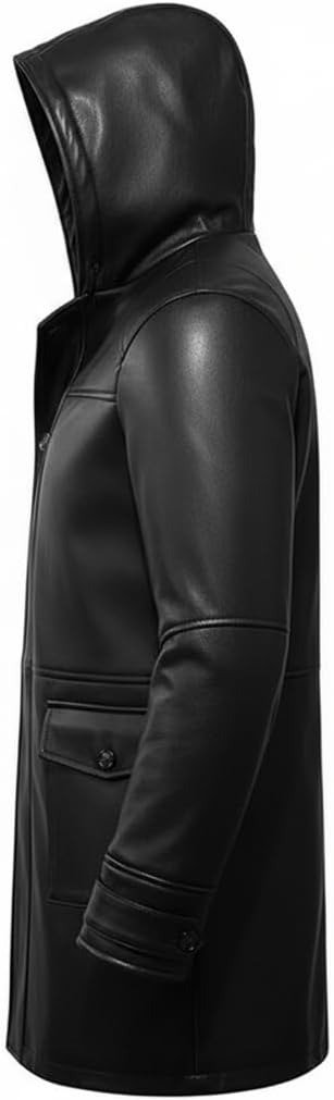 Leather Style Men’s Hooded Trench Coat, Black Leather, Long Length, Button Front Closure, Fitted Design with Hood