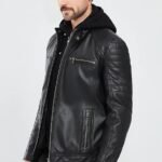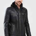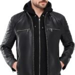 Men’s Leather Biker Jacket – Quilted Shoulders, Asymmetrical Zip, Hoodie Layered Style with Zippered Pockets