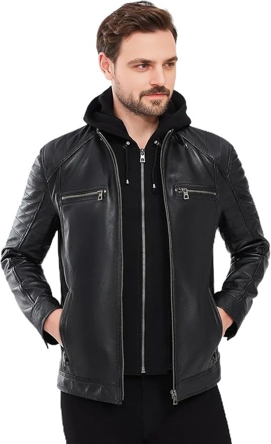 Men's Leather Biker Jacket – Quilted Shoulders, Asymmetrical Zip, Hoodie Layered Style with Zippered Pockets