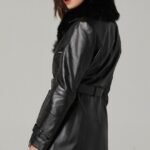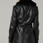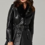The black long leather coat exudes timeless style. Its sleek design features a row of sturdy closure buttons, accentuating its sophistication. A center belt cinches the waist, adding a flattering silhouette. Two flap pockets offer both functionality and visual interest. The sleeves boast zipper detailing, contributing an edgy vibe. The collar showcases an original fur trim, elevating the coat’s luxurious appeal. Crafted from premium distressed sheepskin. This garment harmoniously blends classic elements with modern accents, making it a versatile and captivating outerwear choice for those seeking a bold and refined fashion statement.