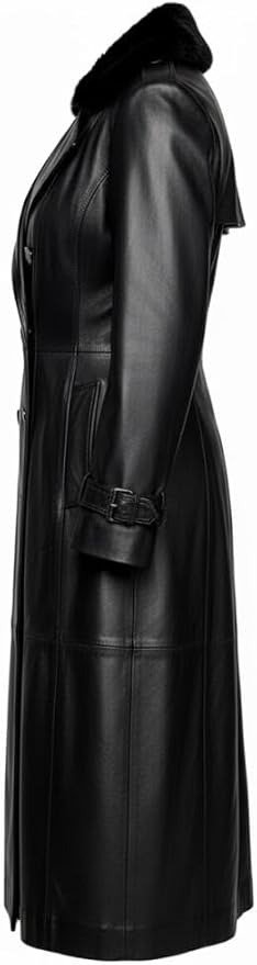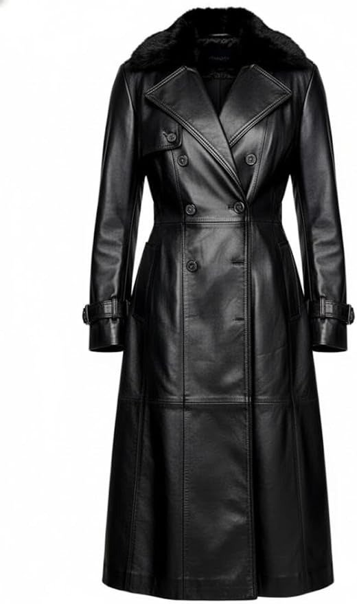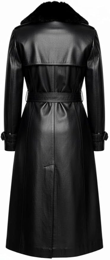 • PREMIUM DESIGN: Full-length leather trench coat featuring a luxurious fur collar, double-breasted front closure, and sophisticated belted waist design
